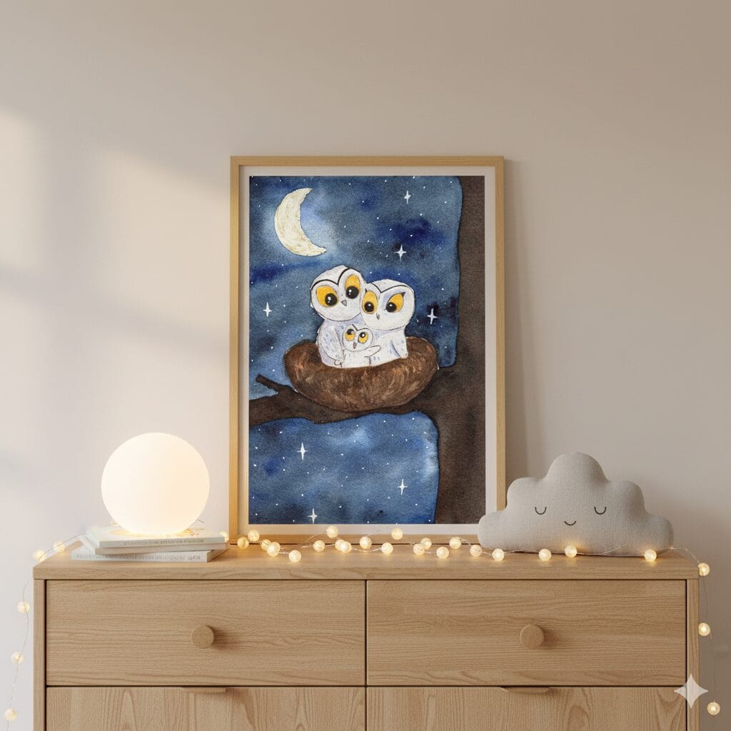 Nichées confortablement dans leur petit nid douillet, trois chouettes affichent une expression de sérénité et de chaleur. La lune, telle une veilleuse bienveillante, éclaire doucement cette scène intime où chaque oeil, brillamment doré, capte les éclats de l’univers.