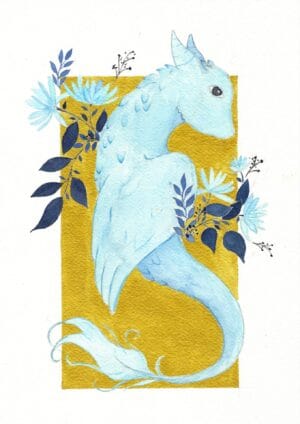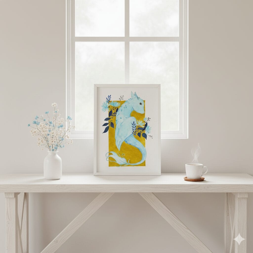 Il était une fois, perdue dans les légendes oubliées du grand Nord, une créature mythique que les anciens appelaient le Gardien des Brumes Glaciales. Ce dragon céleste, à la robe d’un bleu glacial, semblait veiller sur les secrets cachés des fjords nordiques. Sa queue ondulante, telle une rivière gelée, se mêlait aux vents glacés porteurs des murmures du passé.