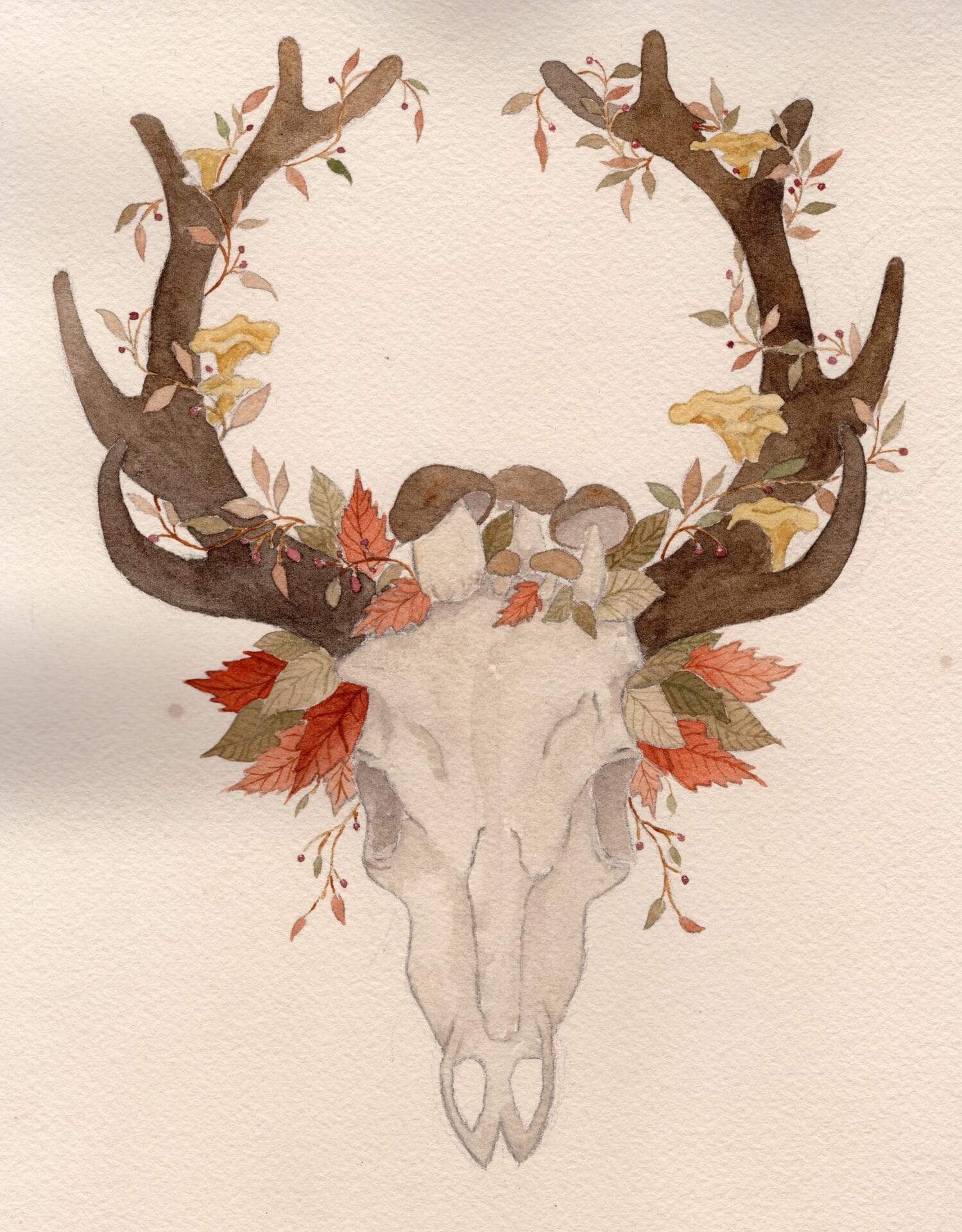 “Silence des Bois” est une aquarelle empreinte de calme et de mystère, où un crâne de cerf se pare de la délicatesse de la forêt automnale. Les bois, couverts de champignons, de feuilles rousses et de baies fines, évoquent le cycle de la vie et la beauté fragile de la nature sauvage.