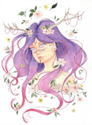 Dans cette aquarelle, j’ai voulu réinterpréter la volvä, pour l’associer au printemps🌷, comme une prophétesse qui réveillerait la nature après la rigueur de l’hiver avec sa magie et ses rituels. Ses longs cheveux pourpres, ornés de fleurs épanouies, évoquent le doux souffle du renouveau qui parcourt champs et forêts. Les bois qui surgissent de sa chevelure en font une créature mi-humaine mi-déesse, puissante et intrigante mais bienveillante. 🌼